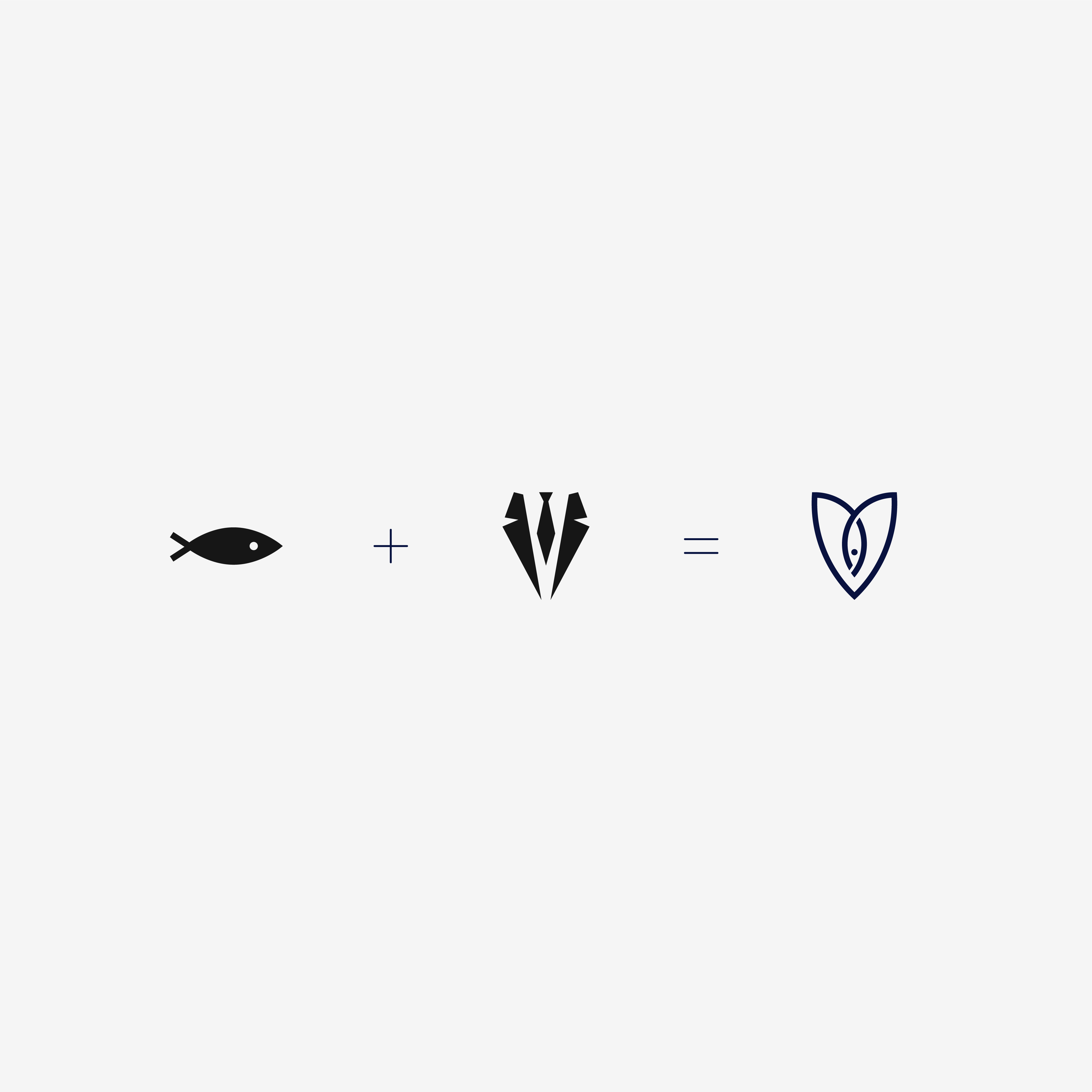 The logo blends the form of a fish with a tailored suit, while the deep blue palette evokes the ocean’s depth, reflecting the seamless harmony of luxury, quality, and the sea.